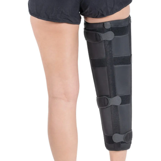 Бандаж для колена – это легкая и прочная разъемная повязка для иммобилизации колена под небольшим углом 20 градусов. Шина позволяет наступать на ногу, но полностью исключает движение в суставе.