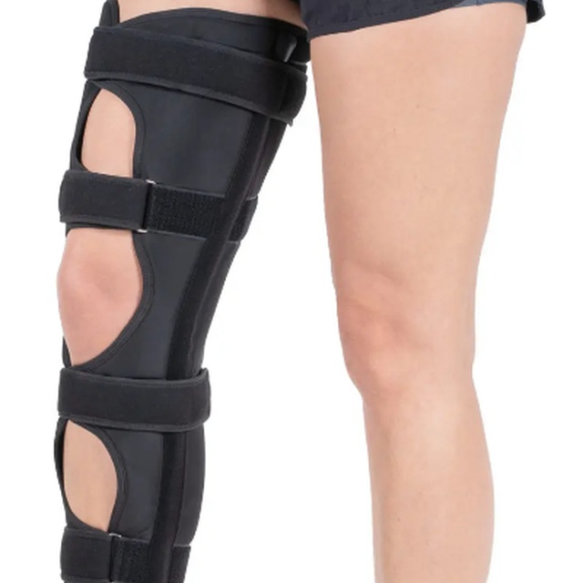 Коленная "чашечка" открыта. Голень и бедро стабилизируются крепкими пластинами из металла. С внутренней стороны приятная мягкая ткань удобна для кожи. Шина на колено вручную одевается и регулируется липучками.